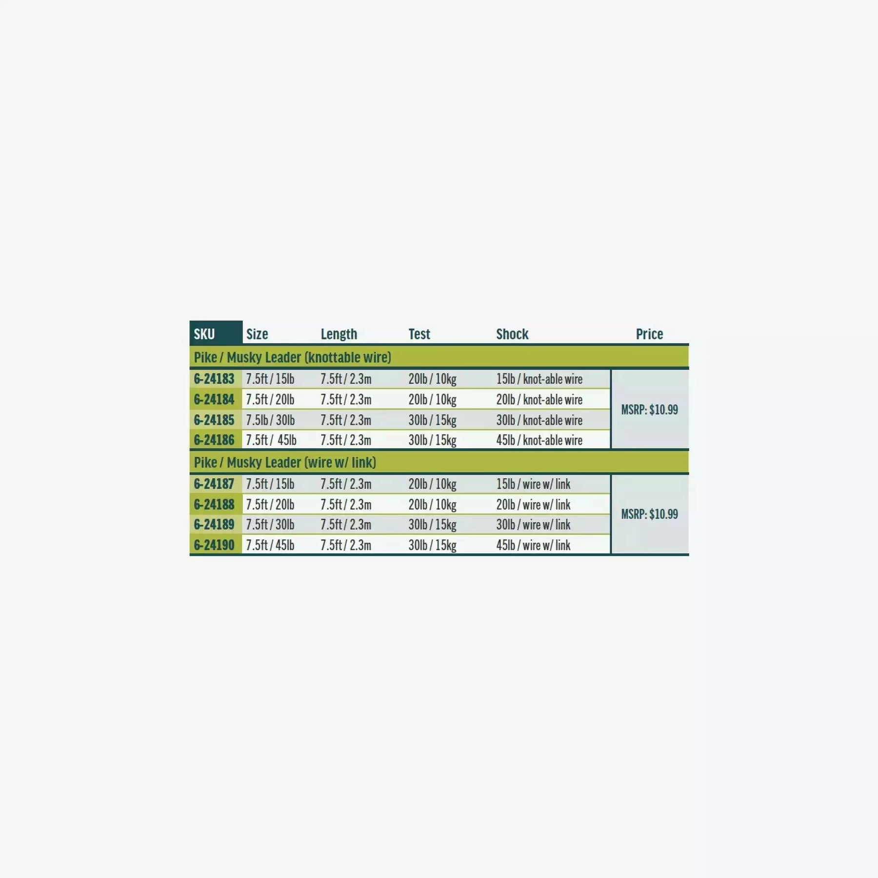 Each option is available with 15 lb, 20 lb, 30 lb and 45 lb wire strength bite tippet. The 15 lb and 20 lb wire leaders are attached to a 20 lb class tapered leader, while the 30 lb and 45 lb wire bite tippet options are attached to a 30 lb class tapered leader.